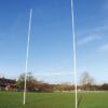 Manufactured from a heavy-duty steel profile, the Sabre Champion Hinged Steel Rugby Posts feature the same specifications as the non-hinged option but are supplied with hinged adaptors for ease of erecting and demounting posts. Supplied with sockets that are 120cm deep and are made from 101mm OD Steel. The posts and sockets are supplied powder coated white and come complete with zinc plated nuts, washers, bolts, and plastic socket caps.